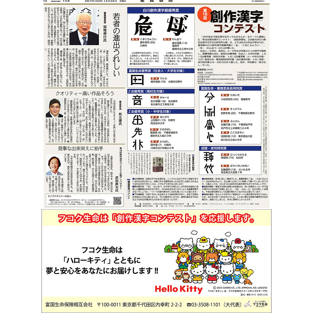 「第16回創作漢字コンテスト」(主催:産経新聞社ほか、特別協賛:富国生命保険相互会社)の入賞作品を紙面で紹介しました。同コンテストは「100年後まで残る漢字を作ってみませんか」をテーマに募集し、今回は2万1856点の作品が寄せられました。
