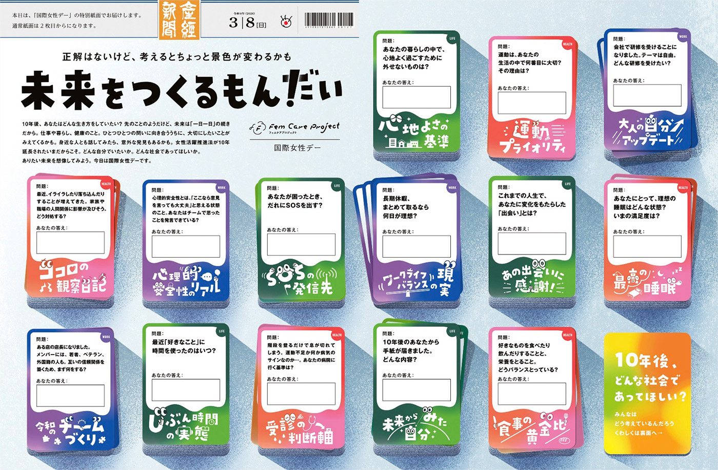「未来」をキーワードにしたフルラッピングの特別紙面では、読者が自分自身の価値観を探り、理想とする未来の形を想像する機会につなげようと、暮らしや健康、仕事にちなんだ15の問いをカード形式で提示し、読者参加型の企画に挑戦しました。一方的な発信に終わらず、カードの問いに対する「答え」や、読者が考えるオリジナルの「問い」を募集したところ、約100人(2026年3月末現在)の応募が寄せられるなど、読者との双方向の取り組みに発展させることができました。