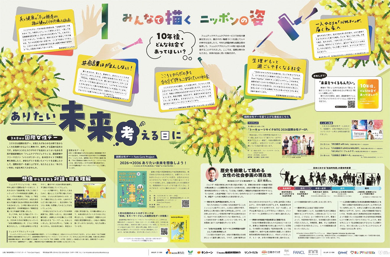 26年春は時限立法の「女性活躍推進法」が改正され、2036年3月末まで10年延長されるタイミングでした。そうしたニュース性を捉えて、「2026→2036 ありたい未来を想像しよう!-ココロとカラダに向き合い〝対話〟につなげるFES-」をテーマに掲げ、2月末から、産經新聞本紙やWEBニュースサイト「産経ニュース」で女性活躍推進に関わるニュース・連載を発信。メトロポリターナでも、「歴史」と「カラダ」の2軸で読者が未来に思いを馳せる特集記事を掲載したほか、3月22日には、著名ゲストや専門家によるトークセッション、ワークショップ、ブース出展を盛り込んだリアルイベントを開催しました。