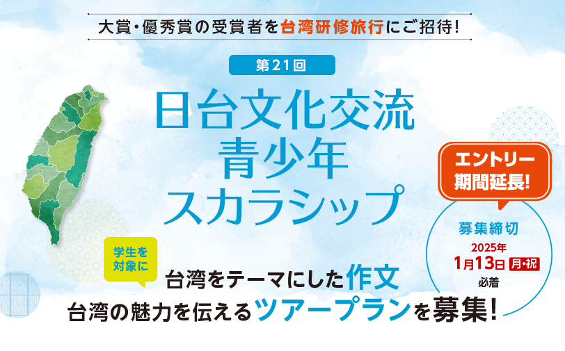『第22回日台文化交流 青少年スカラシップ』は、日本の学生を対象に、台湾をテーマにした「作文」と、台湾の魅力を伝える「ツアープラン」を募集。応募者の中から選ばれた大賞・優秀賞の受賞者を台湾研修旅行に招待します。台湾の歴史と現状について学び、日本と台湾の未来について考える学生を応援し、将来の日台友好に貢献する人材を育てることを目的に本事業を実施します。